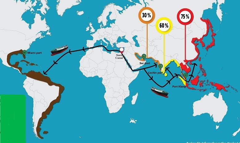 a) Arabian Gulf (ports within the Arabian Gulf starting from Sur port Oman) and its eastern ports until Cochin at the west of India, rebate of 30% on Suez Canal normal tolls.